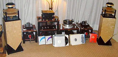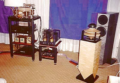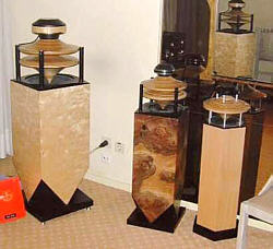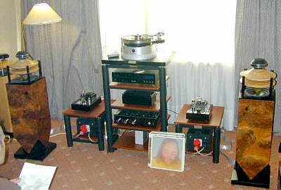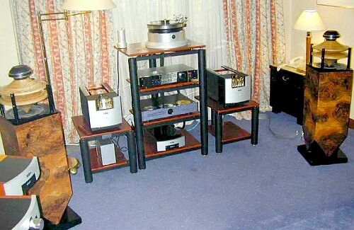 They had many vinyl set-ups. The CD Acoustics speakers (2,000,000drms), driven by the KR enterprise model "Kronzila" integrated amplifier (T-1610 huge valves 150W, custom made for high power + phono stage) or the KR premodel 3 preamplifier. Analog source was the Clearaudio "master reference" turntable (3,600,000drms arm incl.) with 3 identical motors driving the platter and the "insider gold" cartridge(2,250,000drms), mounted on the Clearaudio unniversary linear arm. Speaker cable was the Nordost "SPM" bicable (USA). System seated on racks by Audiomagic Production (Denmark). May be the best sound in the Show. At the back of the top photograph top model of Audiophysic is shown, the Medea (9,000,000drms). |