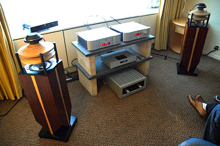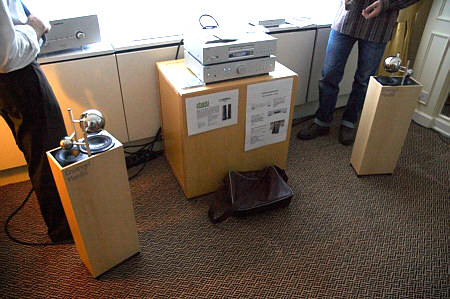Dans une autre pièce, vous pouviez voir une autre surprenante réalisation de cher Duevel, les enceintes Planet, aussi agréables à regarder qu’à écouter. La sensation de garder la même scène sonore en changeant de point d’écoute est fort agréable. Le toute fonctionnait avec les CEC CD3300R et AMP3300R.