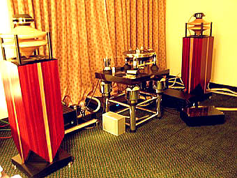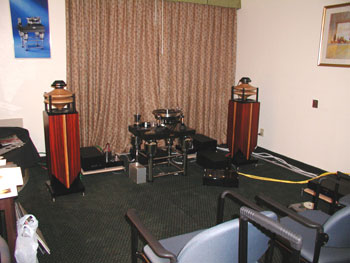 Regardless, there was something supremely airy, spacious and non-electronic about this 7-watt triode-driven room that, for lack of a less overgrazed word, must be dubbed relaxed and very natural. Curiously enough, this very same quality also caused a slightly distanced reaction in me. By comparison, I found the Audiopax/Zanden room more involving. Still, I got enough of an 'omni hit' to want to delve far more deeply into this brand than my pressed-for-time show presence allowed. Incidentally, our own Count Turoczi [or Les-is-more to his friends] is slated to do the honors on Marcus Duevel's top Jupiters once importer Ted can secure a review pair. Jules meanwhile's got the major reviewer Jones for the massive Pluto table and, audio gods willing, may actually get his hands on one for a 2004 write-up. And while greed's ruling, someone here at 6moons oughta do not lunch but Dusan Klimo's Beltane monoblocks. Monsieur Ted?