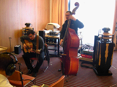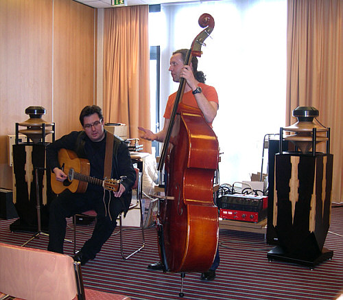Dabei wurde immer ein Titel live gespielt und dann das gleiche Stück von Schallplatte. Allerdings waren die 'Quellen' zu unterschiedlich für einen direkten Vergleich: auf der einen Seite, der sehr intime Vortrag der Musiker in unserem relativ kleinen Raum (ca. 40qm) und auf der anderen Seite die Konserve, die in einer über 600qm großen Musikhalle ohne Publikum aufgenommen wurde. Die Schallplatte enthält also den natürlichen Hall des großen Konzertsaals, dessen Raumeindruck von unserer Jupiter in den Ausstellungsraum projeziert wurde. "Das klingt ja so wie bei der Aufnahme!" war dann auch der Kommentar von Wolfgang Bernreuther, so daß wir diese Session unbedingt wiederholen werden und zwar auf der Highend in München.