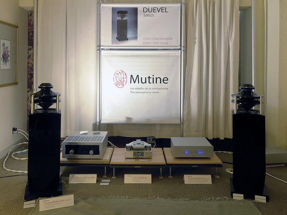 Mutine had two lovely sounding rooms, one featuring Duevel's Bella Luna Diamante, Audiomat Recital integrated, Audiomat Maestro Reference DAC, CEC TL0X transport and Actinote cabling.