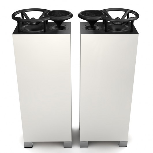 Malgré son apparente simplicité, le coffret est assez sophistiqué, surtout en ce qui concerne la charge acoustique. En effet, Duevel n’utilise que très peu de matériau amortissant. En revanche il a développé un filtrage mécanique sous la forme d’une paroi oblique placée entre les deux transducteurs, et percée d’une multitude d’orifices coniques qui absorbent l’onde arrière, sans retour en arrière possible, ce qui permet au boomer de fonctionner avec une grande fluidité sans être pollué par la voie interne. L’évent de décompression de la charge bass-reflex est situé tout en bas, vers le sol, à côté du bornier HP de type monocâblage. C’est l’une des raisons pour lesquelles l’enceinte est surélevée au moyen de quatre solides pieds métalliques. L’Enterprise est disponible dans un certain nombre de finitions : rouge, blanche, noire ou grise. A priori, un nuancier encore plus étoffé sera proposé par la suite.